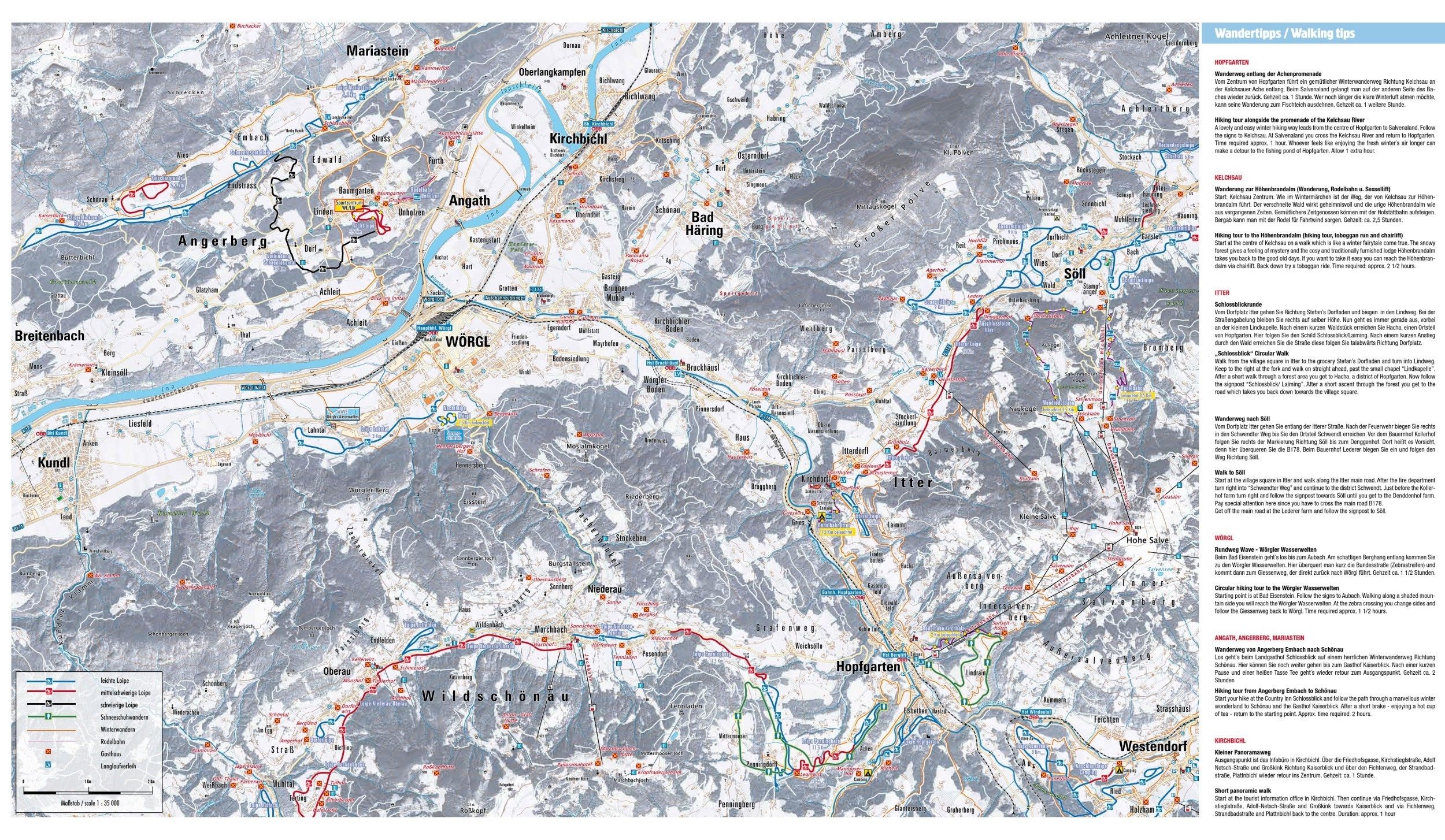Rețeaua extinsă de trasee acoperă toate nivelurile de dificultate și este conectată cu pârtiile din St. Johann și Kitzbühel. Schiorii experimentați pot explora pârtia provocatoare din Angerberg sau traseul de 8,4 km din Kelchsau, cu o diferență de nivel de aproximativ 200 de metri. Cunoscătorii vor aprecia condițiile excelente oferite de pârtii precum cea de 2,2 km din Hochbrixen sau Sunnseitloipe din Söll, care impresionează și prin priveliști spectaculoase.