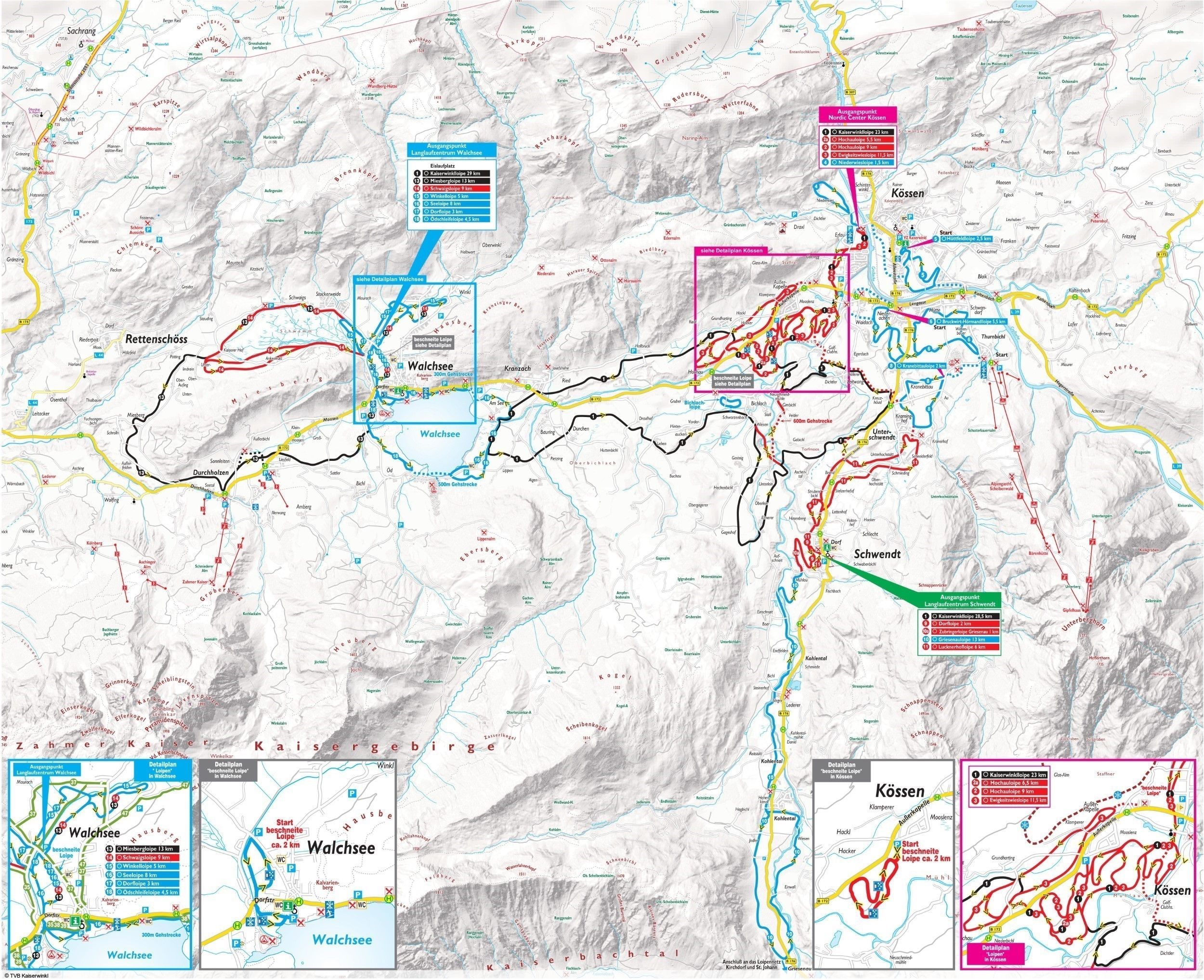 Cea mai lungă şi în acelaşi timp şi cea mai exigentă pârtie este Kaiserwinkl. Acest circuit de 23 km lungime leagă staţiunile Kössen, Walchsee şi Schwendt. Mai uşoare sunt pârtiile din staţiunile Schwendt şi Walchsee de o lungime de 2 respectiv 3 km. Pârtia din Kössen oferă 5,5 respectiv 9 km lungime este de nivel mediu pentru cei care au un anumit nivel de experienţă.