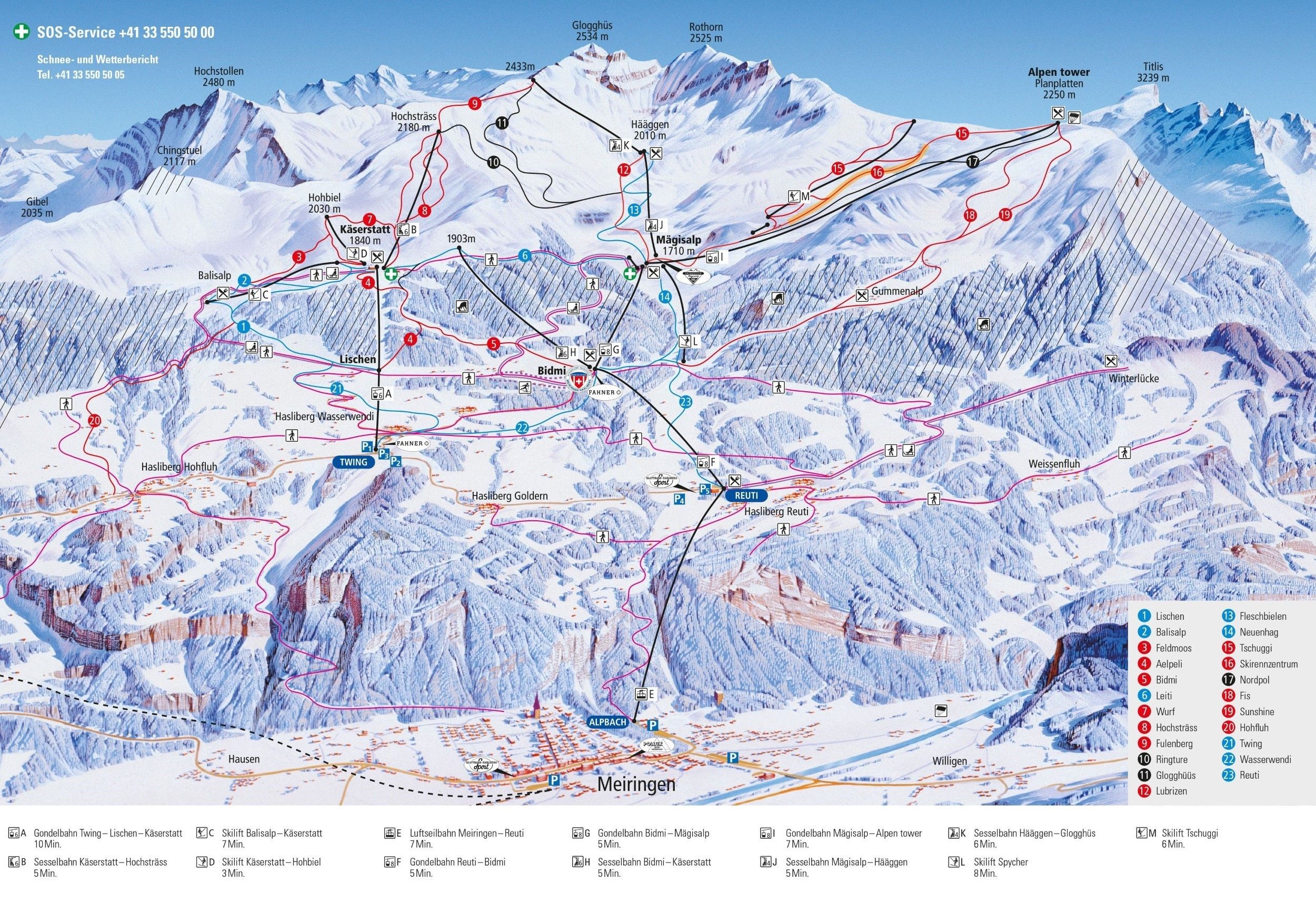 Fermecătoarea aşezare Hasliberg este alcătuită din 4 părţi: Wasserwendi, Hohfluh, Goldern şi Reuti. Este situată după cheile Brünigpass (1008 m) şi la poalele Planplatten (2250 m), mai sus de foaret animata vecină Meiringen. Hasliberg este o staţiune de schi îndrăgită şi bine cunoscută şi este considerată ca fiind una din cele mai primitoare pentru familii din Berna Superioară. La o altitudine de cca. 1100 m vă puteţi bucura de paorame incredibile asupra lumii montane înconjurătoare cu vârfurile Glogghüs (2534 m), Hochstollen (2480 m) şi Rothorn (2525 m).Din Reuti şi Wasserwendi ajungeţi cu telecabina direct în domeniul schiabil. Trasee de drumeţii de iarnă unesc zonele şi duc chiar la Meiringen. Datorită situării ideale chiar lângă domeniul schiabil Hasliberg oferă o gamă largă de oferte pentru pasionaţii mai mici şi mai mari ai sporturilor de iarnă.