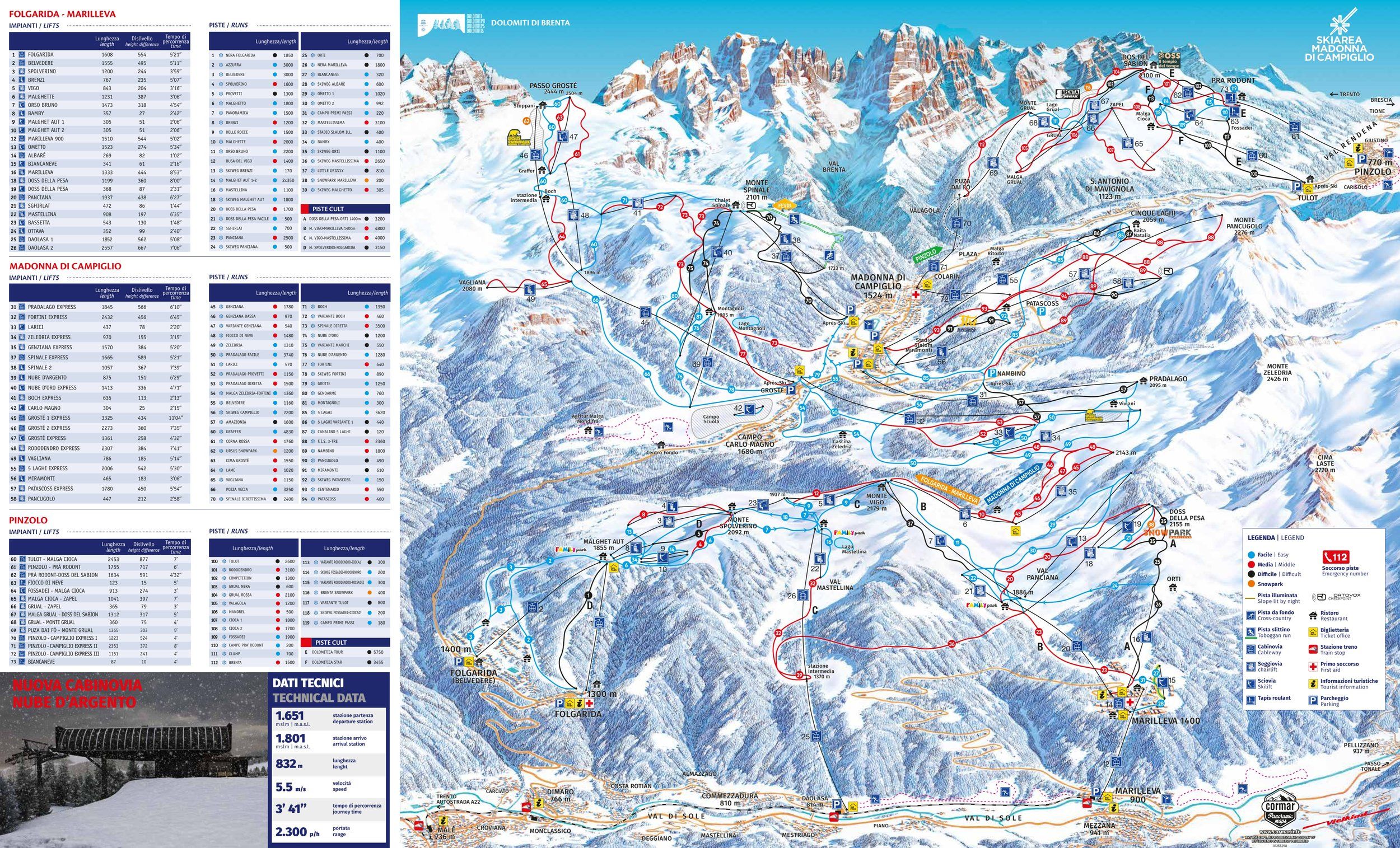 Domeniul schiabil Madonna di Campiglio dispune de 60 km de pârtii și 20 de instalații pe cablu, majoritatea pornind din centru, iar traseele predominant ușoare și intermediare sunt ideale pentru începători și schiorii de agrement. Experții se pot bucura de faimoasa pârtie FIS „3-Tre”, unde se desfășoară Cupa Mondială de slalom masculin, și de „Spinale Direttissima” de pe Monte Spinale. Pârtia iluminată „Canalone Miramonti” oferă distracție seara, iar snowboarderii și freeriderii pot explora numeroase zone de freeride și zăpadă adâncă, precum și 2 snowpark-uri mari: snowpark-ul de pe Grostè, considerat unul dintre cele mai mari din Europa, și fun-park-ul cu half-pipe din Pinzolo.